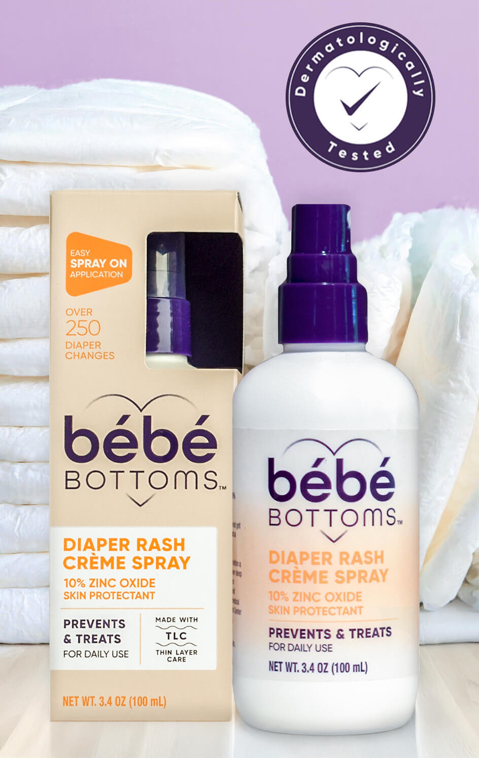 We recommend treating diaper rash before it begins by using bébé Bottoms™ at every diaper change. Unlike thick diaper rash creams, bébé Bottoms™ is made with TLC - Thin Layer Care™, our proprietary technology that has the efficacy of a thick cream but in a light formulation that requires a thin layer of application from the spray bottle, allowing the skin to still breathe as it heals. Each pump sprays a perfectly dosed thin layer of product. If you haven’t been using a diaper rash cream with each change, start using one at the first sign of diaper rash or irritation.